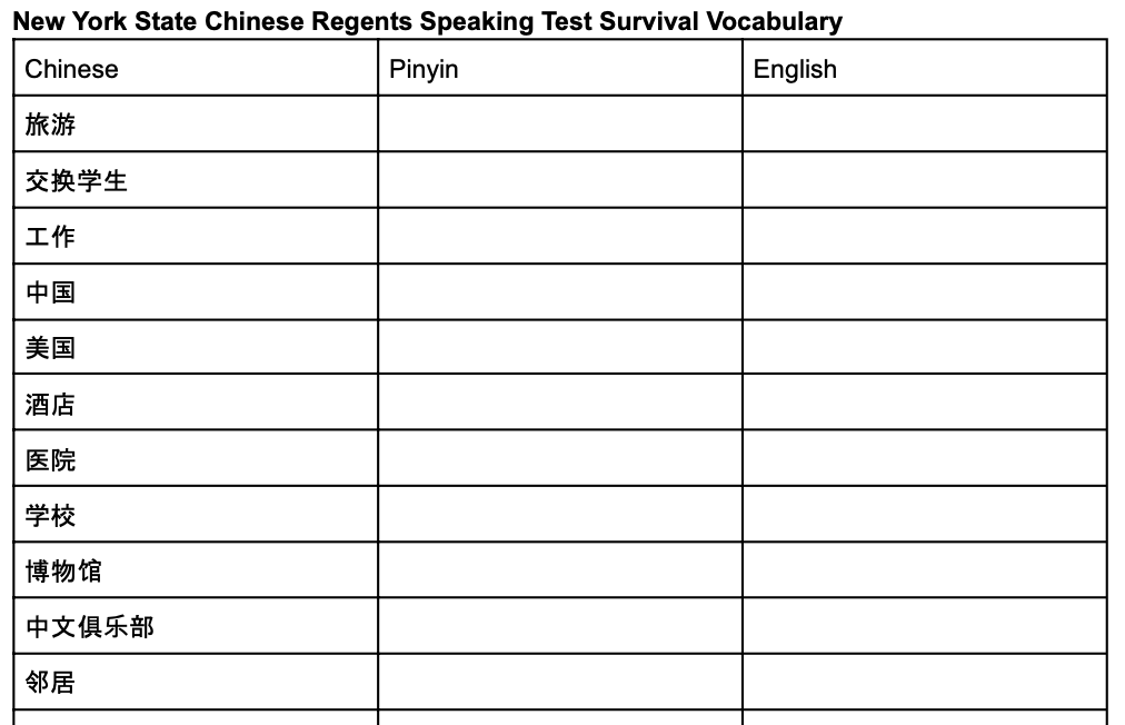 New York State Chinese Regents Speaking Test Survival Vocabulary